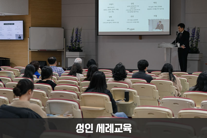 성인 세례교육26.03.222026.3.20(금) 본당 지하1층 제1예배실 부활주일에 세례와 입교를 받을 대상자들이 예식에 참여하기 위해 교육을 받았습니다. 출석을 확인하며 세례 당일 참석할 예배를 알리고 교육을 받으러 예배실로 입장했습니다. 강의를 시작하기 전 김경진 담임목사가 출연한 ‘세례란 무엇인가요?’ 영상을 시청했습니다. 세례의 역사적 배경과 과정, 방법, 의미 등을 배우고, 세례가 그리스도인 됨의 필수임을 깨달았습니다. 제직교육부의 총무 백순권 집사가 교육을 진행할 목회자를 소개했습니다. 조지훈 목사가 배부된 세례교육 책자를 중심으로 본격적인 세례교육을 진행했습니다. 교육생들은 귀 기울여 들으며 마음에 담고 기독교 신앙의 기초를 닦았습니다. 세례교육을 받고 4월 4일 문답을 마친 대상자들은 4월 5일 부활주일 예배 중 세례 및 입교를 받습니다. “그러나 너는 배우고 확신한 일에 거하라 너는 네가 누구에게서 배운 것을 알며 또 어려서부터 성경을 알았나니 성경은 능히 너로 하여금 그리스도 예수 안에 있는 믿음으로 말미암아 구원에 이르는 지혜가 있게 하느니라” -딤후3:14~15-i소망홍보영상팀 -