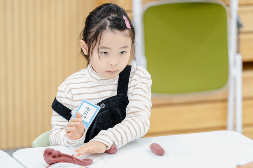 분반 활동 때 점토로 만들기를 하며